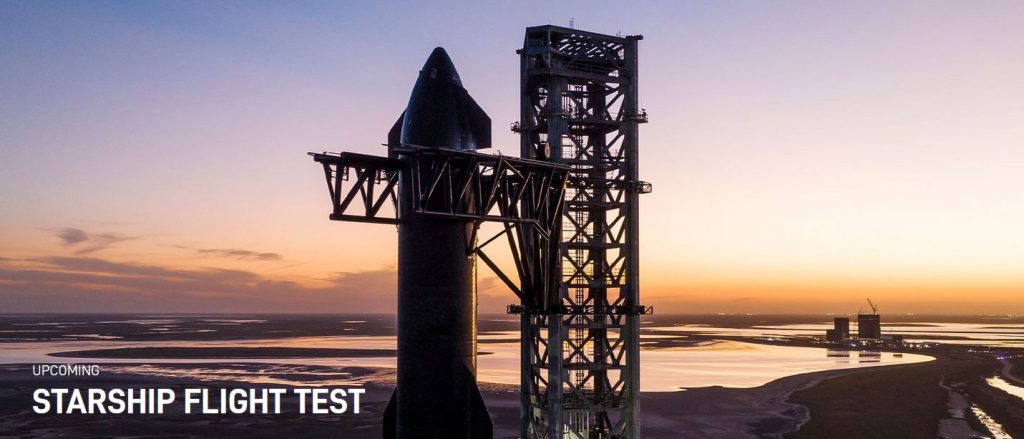 NOTE: Thursday, April 20, 2023 for the first flight test of a fully integrated Starship and Super Heavy rocket from Starbase in Texas. The first launch made it to point of first stage separation and at that point failed to separate first stage rocket and then exploded.